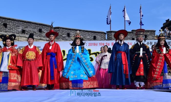 [산수화 기자단=미디어타임즈] 과거와 미래를 잇는 축제의 장 ‘제56회 수원화성문화제’가 지난 3일부터 화성행궁, 장안공원, 연무대 등 수원화성 일원에서 개최되고 있는 가운데, 5일 오후 2시 수원화성 화서문 특설무대에서 ‘2019 Again Joseon-시민과 함께 조선을 거닐다' 행사가 진행됐다.