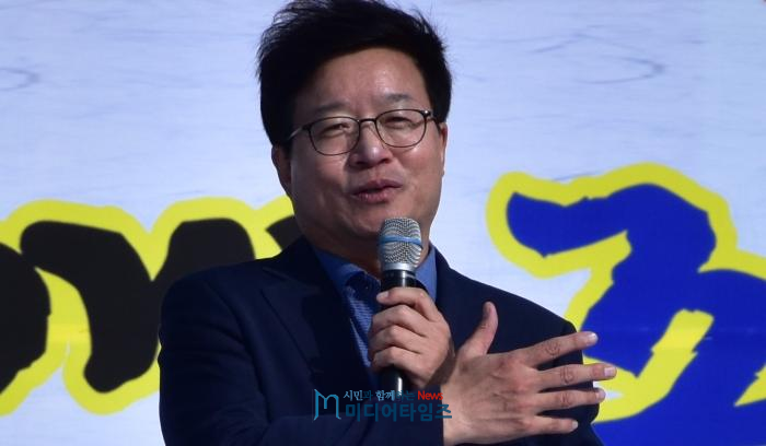 5일 오후, 염태영 시장이‘2019 Again Joseon-시민과 함께 조선을 거닐다' 행사장 무대에서 인사말을 하고 있다.<사진=ⓒ미디어타임즈>