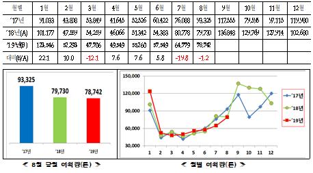 해양수산부는 2019년 8월 연근해어업 생산량이 지난해 8월에 비해 1.2% 감소했다고 밝혔다.