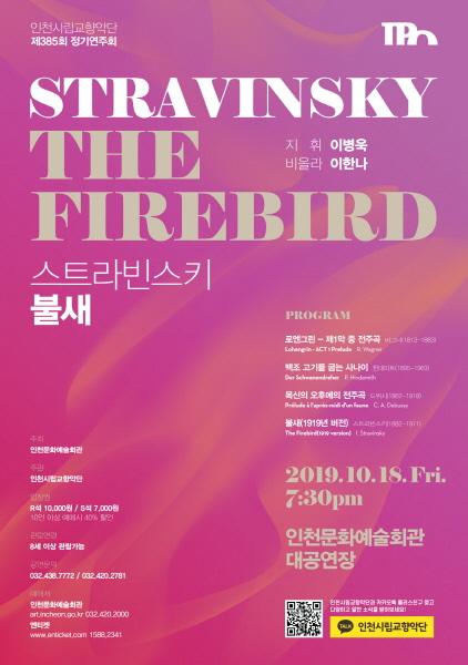 인천시립교향악단 제385회 정기연주회 ‘스트라빈스키 불새’은 18일 금요일 저녁 7시 30분 인천문화예술회관 대공연장에서 열린다. 티켓은 R석 1만원, S석 7천원이며, e음카드 소지자는 30% 할인된 가격으로 음악회를 즐길 수 있다.