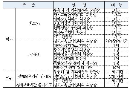 구체적으로 경제부총리상과 경제교육단체협의회장상, KDI 원장상, 4개단체 회장상 등 총 33개 기관·개인을 선정하여 상장과 소정의 상금 및 상품을 수여할 예정이다.