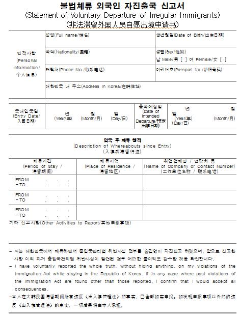 제출 서류는 여권, 출국 항공권·승선권, ‘자진출국 신고서’이며, 자진출국 신고서 양식은 ‘출입국·외국인정책본부’ 홈페이지 또는 ‘하이코리아’ 등에서 내려 받을 수 있다.
