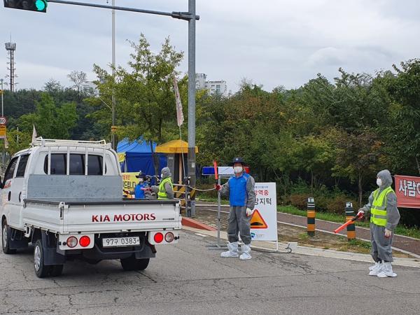 이와 함께 의정부시지역자율방재단은 10월 1일부터 아프리카 돼지열병의 전국 확산을 막고자 자발적으로 매일 16명씩 총 475명의 대원들이 교대로 방역활동에 동참하고 있다. 특히, 방재단 대원들은 차량이 천천히 통과하여 차량 방역이 철저히 이뤄질 수 있도록 안내함으로써 돼지열병 확산 방지에 최선을 다하고 있다.