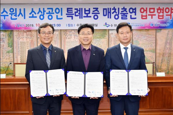 수원시·경기신용보증재단·기업은행은 7일 시청 상황실에서 ‘수원시 소상공인 특례보증 매칭출연 업무 협약’을 체결하고, 소상공인 육성에 적극적으로 협력하기로 했다.
