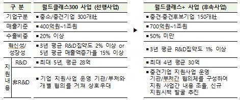 ‘월드클래스+ 사업’은 기업 성장을 위한 기술개발과제를 기업 주도적으로 발굴하는 바텀-업 R&D 지원방식의 ‘월드클래스 300’ 기본골격은 그대로 유지하되, 지난 10년간의 사업여건, 글로벌 환경변화에 따라 지원대상, 사업구조, 지원체계 등 세부사항들을 일부 보완·변경했다.