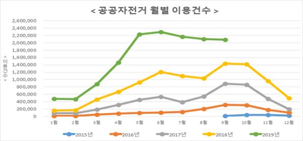 서울시 대표 공유경제서비스인 공공자전거 ‘따릉이’는 2015년 2,100대를 시작으로 불과 4년 만에 25,000대로 12배 이상 확대되고, 지난 9월 한달 평균 이용건수는 69,474건으로 역대 9월중 최고치를 기록하며 서울시민의 명실상부한 대중교통수단으로 자리매김하고 있다.