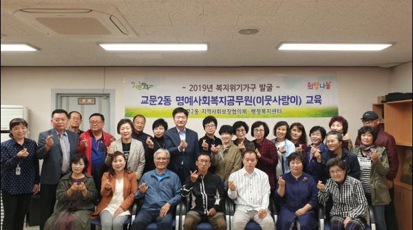 교문2동 명예 사회복지공무원은 주민들이 자발적으로 참여하는 무보수 명예직의 사회복지 인적 안전망으로 복지 위기 가구를 발굴하여 교문2동 행정복지센터에 제보, 신고하는 역할을 담당하고 있다.