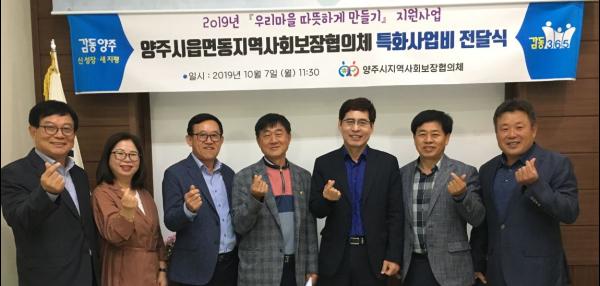 양주시지역사회보장협의체는 지난 7일 양주시 읍면동지역사회보장협의체 지정기탁사업 공모 선정에 따라 배분금 전달식을 가졌다.