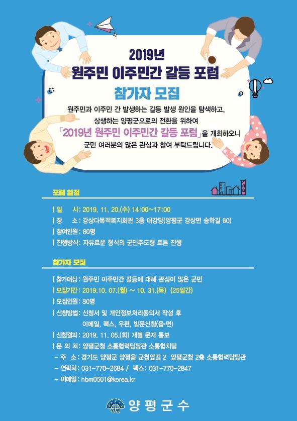 양평군은 오는 11월 20일 오후 2시 강상다목적복지회관 대강당에서 원주민과 이주민 간 갈등 해결 방안을 모색하고자 ‘2019년 원주민 이주민간 갈등 포럼’을 개최한다.
