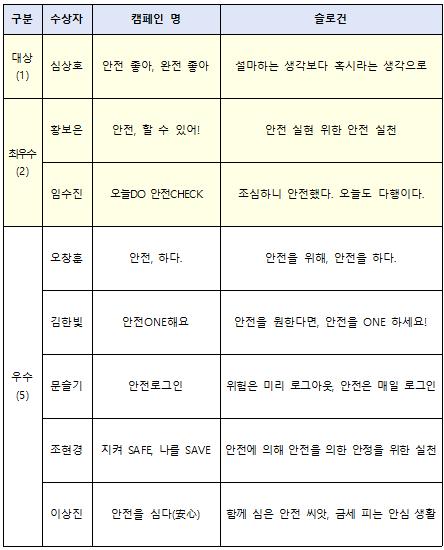 최우수상에는 황보은 씨의 캠페인 명 ‘안전, 할 수 있어’, 슬로건 ‘안전 실현을 위한 안전 실천’ 임수진 씨의 캠페인 명 ‘오늘DO 안전 CHECK’, 슬로건 ‘조심하니 안전했다. 오늘도 다행이다’가 선정됐다.