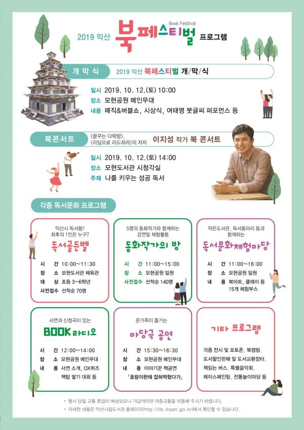익산시립도서관이 오는 12일 모현도서관 및 모현공원 일원에서 ‘2019 익산 북 페스티벌’을 개최한다.