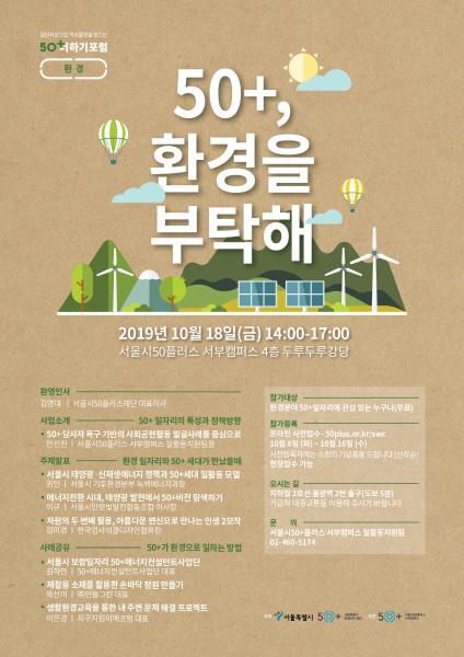 서울시50플러스재단은 환경 분야에서 50+세대의 새로운 일·활동 모델과 연계 가능성을 모색하기 위해 오는 18일 ‘50더하기포럼:50+, 환경을 부탁해’를 개최한다.