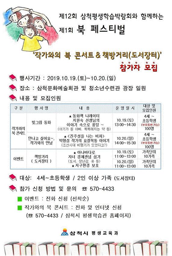 삼척시는 오는 19일부터 20일까지 개최 예정인 ‘제12회 삼척평생학습박람회와 함께하는 제1회 북 페스티벌’의 ‘작가와의 북 콘서트 및 책방거리’ 참여자를 선착순으로 모집한다.