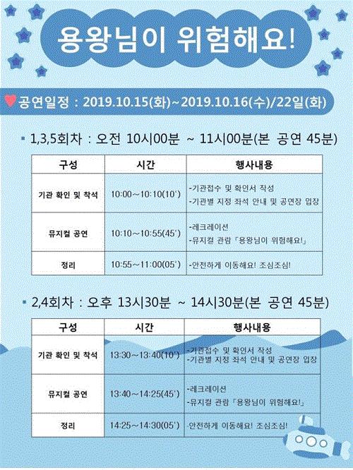 10월 15일과 16일, 22일 총 3회에 걸쳐 백운아트홀에서 진행되며, 원주 지역 어린이집 및 유치원 97개소 만 2~5세 어린이 3,390명이 관람할 예정이다.