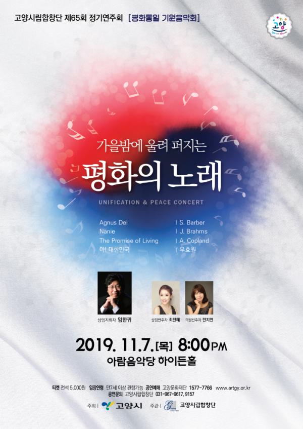 평화의 시작, 미래의 중심 고양시 문화공연의 선두적인 역할을 하고 있는 고양시립합창단은 제65회 정기연주회 ‘평화통일 기원음악회, 가을밤에 울려 퍼지는 평화의 노래’를 오는 11월 7일 저녁 8시 고양아람누리 아람음악당에서 개최해, 가을날과 어울리는 서정적인 하모니가 두드러지는 곡들을 통해 평화통일의 염원을 관객들에게 전달하고자 한다.