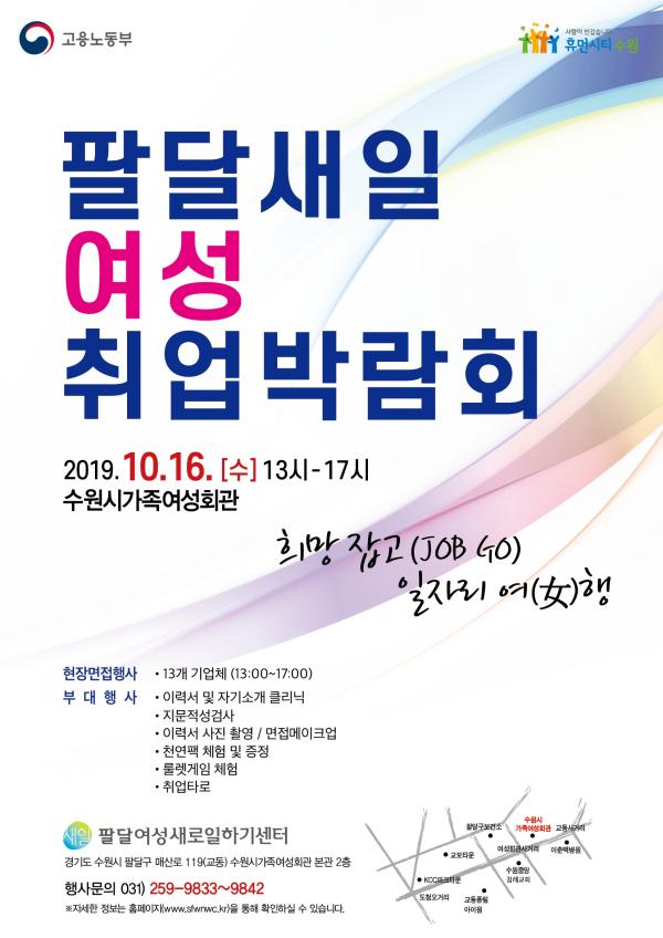 16일에는 수원시가족여성회관에서 ‘여성취업박람회’가 열린다. ‘희망 잡고 일자리 여행’을 슬로건으로 하는 취업박람회에서는 13개 기업이 현장 면접을 거쳐 120여 명을 채용한다. 취업박람회는 오후 1시부터 오후 5시까지 열린다.