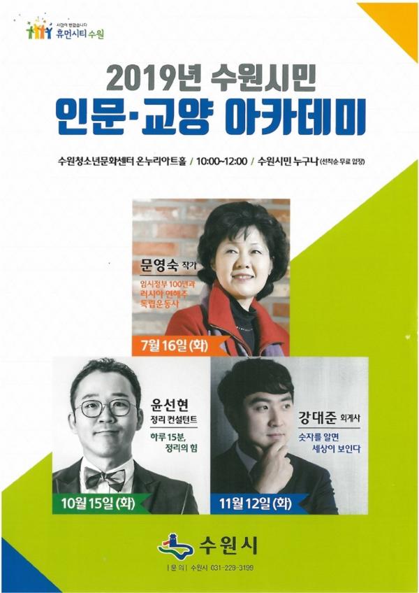 수원시가 오는 15일 오전 10시 팔달구 수원청소년문화센터 온누리아트홀에서 ‘2019 수원시민 인문 교양 아카데미’을 연다.