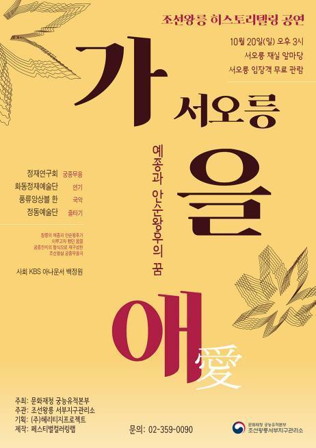 문화재청 궁능유적본부 조선왕릉서부지구관리소는 오는 20일 오후 3시부터 4시 20분까지 고양 서오릉 재실 앞에서 서오릉 ‘가을愛’ 행사를 진행한다.