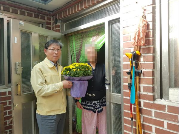 동두천시 생연1동 행정복지센터는 지난 8일 ‘홀몸노인 가족 만들기 사업’으로, 저소득 및 몸이 불편한 홀몸어르신 5가구를 방문해 10월의 꽃 노란 국화 화분을 전달했다.