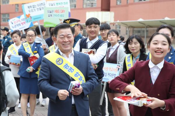 이번 행사는 광명경찰서 학부모폴리스의 ‘사랑한데이’ 캠페인으로 박 시장을 비롯한 학부모폴리스 우수미 단장 및 임원진, 임춘석 광명경찰서장 및 경찰 등이 참석했으며 광명북중 선생님과 학생들이 함께 했다.