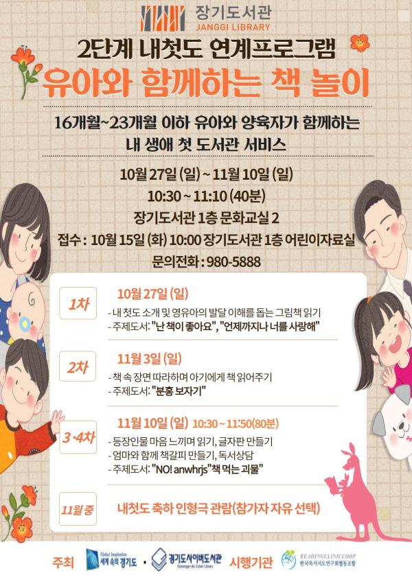 김포시 장기도서관은 경기도사이버도서관‘내 생애 첫 도서관 서비스’와 연계해 ‘유아와 함께하는 책 놀이’를 운영한다.