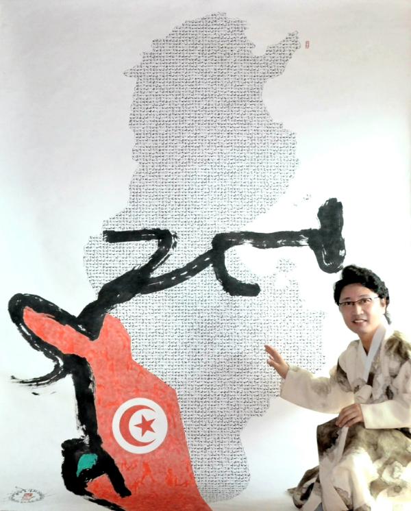 1년 여 동안 한글 붓글씨 5천 여자로 그려진 이번 작품은 튀니지의 문화와 역사, 외교부 개황, 윤소천 시인의 '튀니지의 평화' 시 등을 기록해 가로 1m80cm, 세로 2m50cm 크기로 튀니지 평화지도작품을 완성됐다.