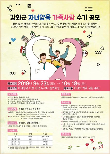 군 관계자는 “강화군도 타 지자체와 마찬가지로 저출산 문제의 심각성을 인식하고, 이에 대한 인식개선 사업을 다각도로 추진하고 있다”면서 “이번 수기 공모와 11월 가족 행사에 많은 참여 바라며, 앞으로도 아이 키우기 좋은 강화를 만들기 위해 지속적으로 노력하겠다”고 말했다.