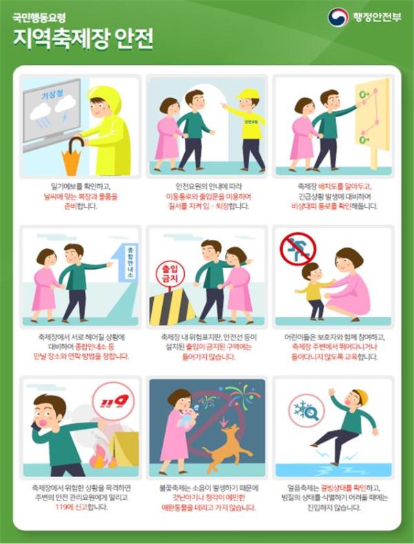 행정안전부는 가을철 지역별로 다양한 축제가 개최됨에 따라 현장에서 발생할 수 있는 안전사고에 각별한 주의를 요청했다.