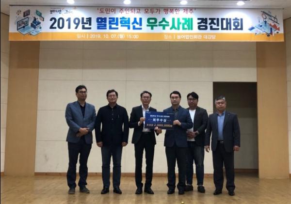 ‘2019년 열린혁신 우수사례 경진대회’결과, 최우수상의 영예는‘민관협력 대중교통체계 신 서비스 구축’ 사례가 선정되었고 우수상은 청정제주 미세먼지 버스 스톱 사업, 서귀포시 옥에 티 찾기 운영, 민관이 함께 만들어 가는 복지 희망애 복지정보, 학교도서관과 마을도서관의 상생 모두 함께 하는‘김영수도서관’, 장려상은 착한사람들과 조근조근 이어가는 복지릴레이 스토리, 각종 사고 및 재난에 대한 안전장치 도민 안전공제보험 실시, 시민 누구나 시정에 참여하는 ‘시민원탁회의’, 남원읍 행복 실버주택, 스마트청사 구축으로 민원 편의 증대 및 협업 모델 구축이 선정됐다.