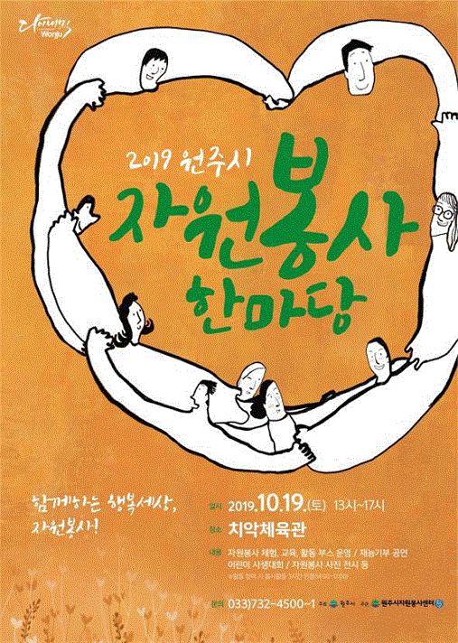 원주시 8만여 자원봉사자들의 축제인 ‘2019 원주시 자원봉사 한마당’이 오는 19일 오후 1시 치악체육관에서 열린다.