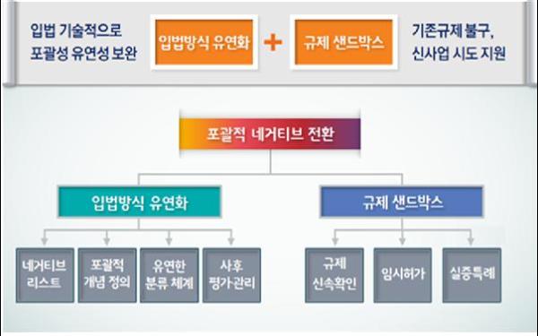 포괄적 네거티브 규제 전환은 4차 산업혁명 시대 신기술 규제혁신의 핵심으로 시민과 기업의 수요에 빠르게 대응할 수 있는 장점이 있다.