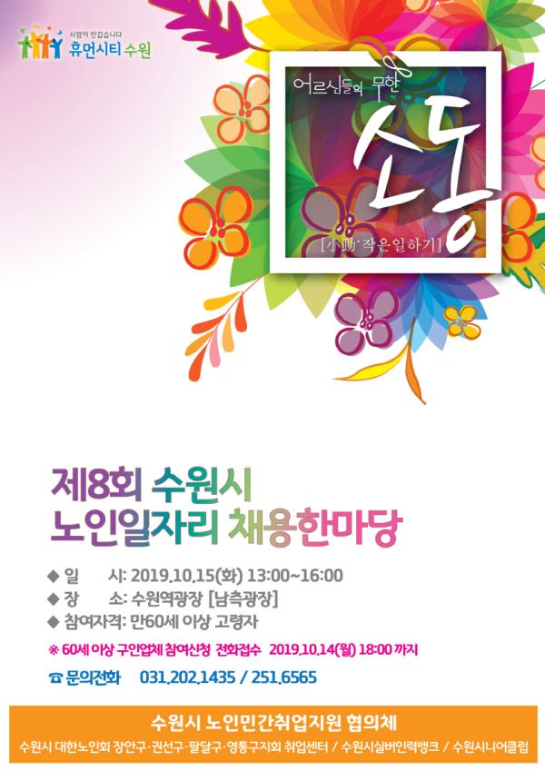 수원시는 오는 15일 오후 1시부터 4시까지 수원역 남측광장에서 ‘제8회 노인일자리 채용 한마당’을 연다.