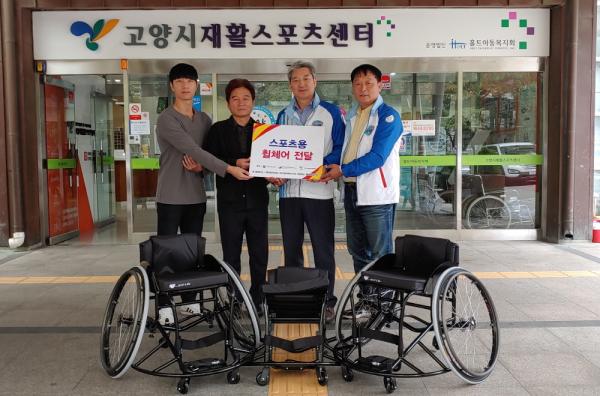 고양시장애인체육회는 지난 10일 오전, 고양시재활스포츠센터에서 한동승 고양시장애인체육회 사무국장, 이석산 고양시재활스포츠센터 센터장, 이춘수 일산직업능력개발원 능력개발 처장, 이창우 홀트장애인종합체육관 특수체육교사가 참석한 가운데 스포츠용 휠체어 3대에 대한 전달식을 진행했다.