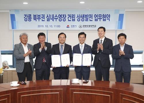 강릉 북부권 실내수영장 건립을 위한 기관 상호 간 협력과 상생발전을 도모하기 위해 강릉시와 강원도립대학교는 업무 협약식을 지난 10일 목요일 11시 강릉시청 시민사랑방에서 체결했다.