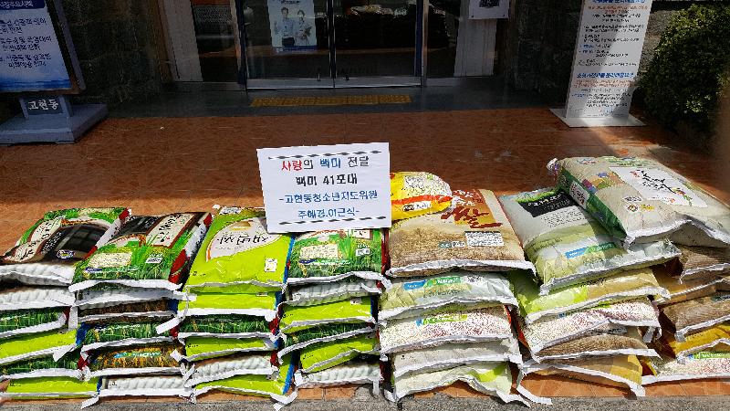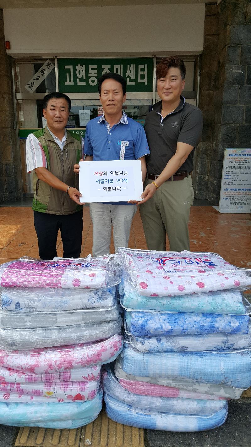고현동 청소년지도위원으로 활동 중인 주혜경 위원은 사업지의 확장개업식에 화환대신 백미를 받아 7월15일 고현동 주민센터(동장 박병한)를 방문하여 백미41포를 기탁하였으며, 이불나라(대표 탁연섭, 중곡로 7길 12 GS마트 내)에서도 14일 오전 더운 여름 날씨를 시원하게 보낼 수 있기를 바라는 마음으로 여름이불 20채를 기탁하여 한여름의 훈훈한 미담이 되고 있다.