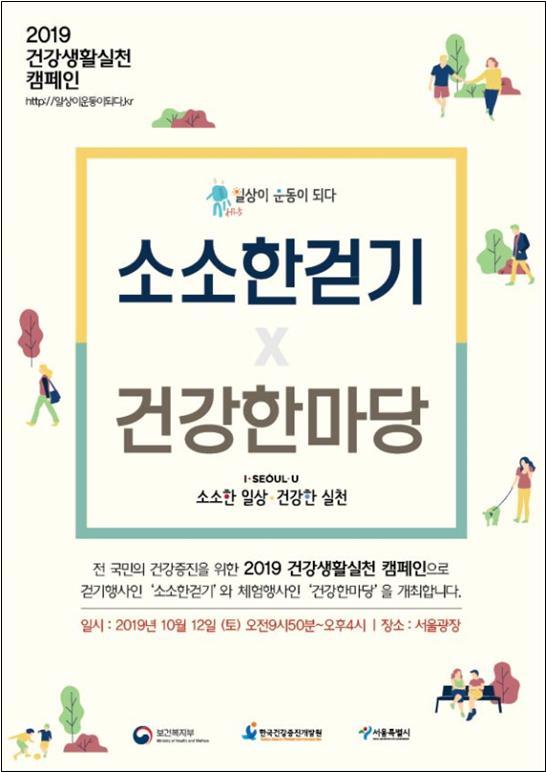 서울시 ‘건강한마당’과 보건복지부 ‘소소한 걷기’를 결합한 대국민 건강캠페인이 대대적으로 열린다. 시는 보건복지부, 한국건강증진개발원과 함께 오는 12일 9시50분 서울광장에서 2019 건강생활실천캠페인 ‘소소한 걷기 X 건강한마당’ 행사를 개최한다.