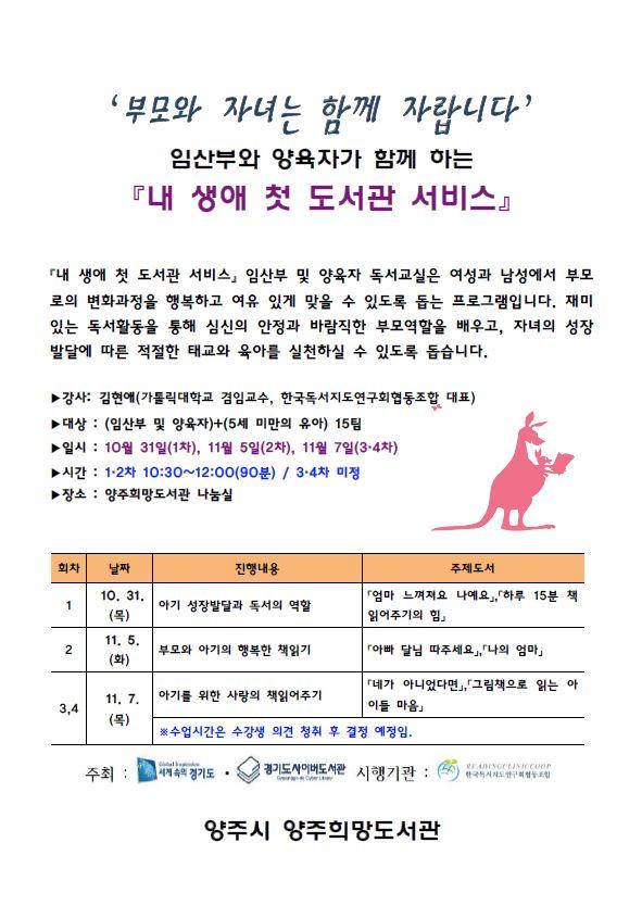 양주시 양주희망도서관은 오는 31일부터 ‘내 생애 첫 도서관 서비스’ 와 연계한 임산부와 양육자 독서 프로그램 ‘부모와 자녀는 함께 자랍니다’를 운영한다.