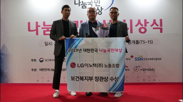 LG이노텍㈜ 노동조합은 지난 10일 보건복지부와 KBS, 사회복지공동모금회가 주최하고 대한민국 나눔국민대상 추진위원회가 주관하는 ‘2019 대한민국 나눔국민대상 시상식’에서 보건복지부 장관상을 수상했다.
