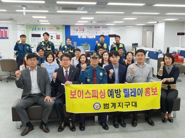 이날 캠페인은 IBK기업은행 직원들과, 범계지구대 직원들이 참여한 가운데, 주민 밀착형 탄력순찰에 중점을 맞추어 찾아가는 보이스피싱 예방활동으로 선제적이고 적극적인 경찰이미지를 홍보하고, 3C 파트너십을 구축 등을 시민들에게 보이스피싱 예방법에 대해 홍보했다.