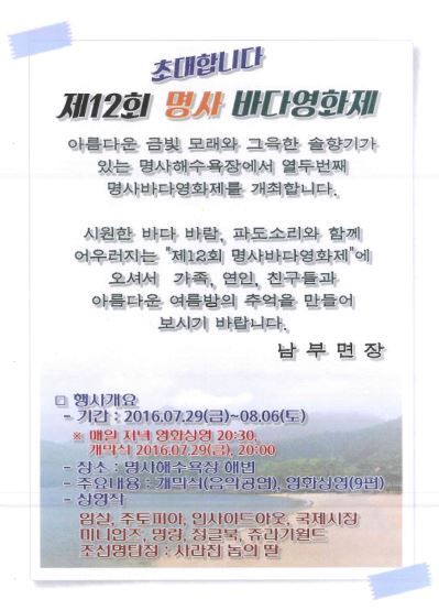 명사 바다영화제는 해마다 명사해수욕장을 찾는 피서객에게 한여름 밤의 추억거리를 선물하기 위해 남부면사무소에서 2005년부터 문화행사로 추진해 오고 있다.