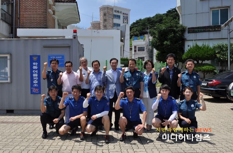 | 거제 학동에 위치한 여름 파출소 방문 근무자들을 격려하고 기념촬영을 하고 있다. |