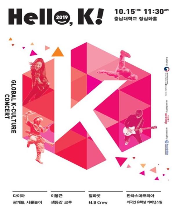 문화체육관광부 해외문화홍보원은 국제방송교류재단과 함께 오는 15일 오전 11시 30분에 충남대학교 정심화홀에서 ‘2019 헬로, 케이’를 진행한다.