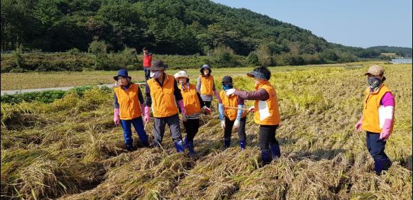 자원봉사자들은 태풍으로 인한 집중호우로 물에 잠겼던 논의 쓰러진 벼를 세우는 작업을 펼쳤다.