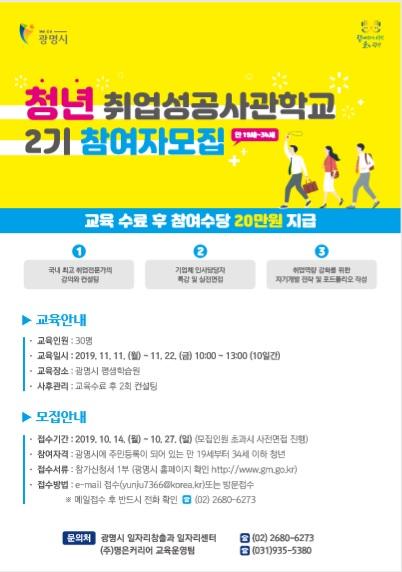 광명시는 청년을 대상으로 적성에 맞는 직업탐색 및 취업 기회를 제공하고자 ‘청년 취업성공 사관학교 2기’ 참여자 30명을 모집한다.