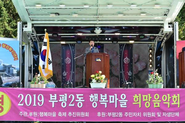 ‘2019 행복마을 희망음악회’는 지난 2016년부터 추진해 온 행사로 ‘부평2동 주민 모두가 한마음으로 화합하고, 오늘 정이 넘치는 행복한 마을이 내일의 희망을 품고 있다’는 뜻이 담겨 있다.