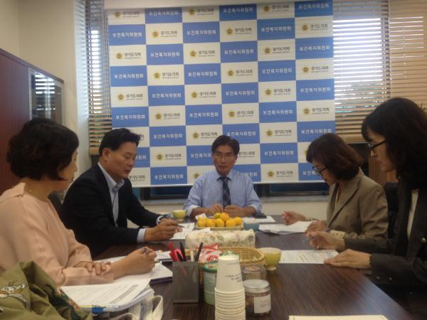 정희시 경기도의회 보건복지위원장은 11일, 보건복지위원회 회의실에서 최종현 부위원장, 김원녀 경기도장애인복지시설협회장 등 관계자들과‘경기도장애인복지시설 직원 역량강화교육사업’등 현안을 논의했다.