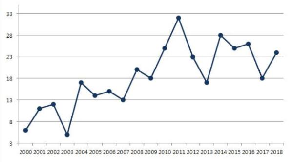 특허청에 따르면, 주요 가축전염병 진단기술 관련 특허출원 건수가 2000년 6건에서 2018년 24건으로, 꾸준히 출원이 증가한 것으로 나타났다.