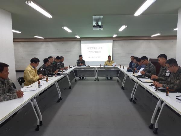 파주시와 1사단은 14일 장단출장소에서 민통선 내 야생멧돼지 아프리카돼지열병 확산 방지를 위한 민·관·군 협력 회의를 갖고 군부대와 민간엽사, 파주시청 직원으로 구성된 포획단을 3개조로 구성해 48시간동안 집중포획을 실시하기로 했다.