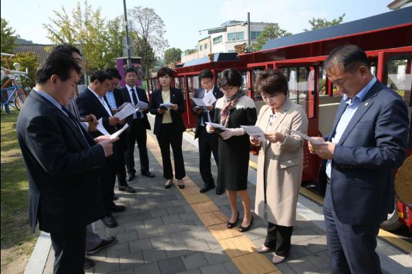 이에 최영옥 문화복지위원회 위원장 및 소속 의원들은 팔달산 코스를 시범 운행하는 신규 화성어차의 기본 제원에 대한 설명을 청취한 뒤 직접 탑승해 운행 점검을 실시했다.
