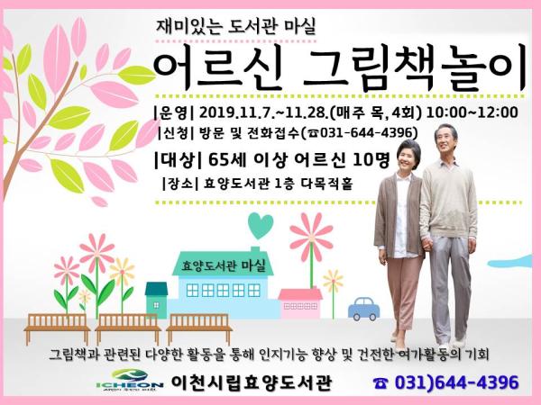 이천시 효양도서관은 오는 11월 7일부터 재미있는 도서관 마실 ‘어르신 그림책놀이’ 프로그램을 운영한다.